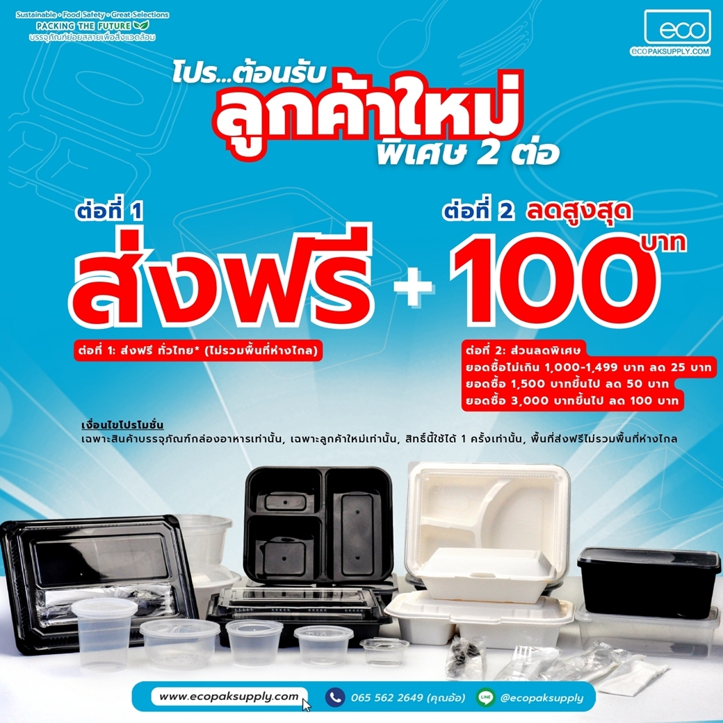 เงื่อนไขโปรโมชั่น ●เฉพาะสินค้าบรรจุภัณฑ์กล่องอาหารเท่านั้น ●เฉพาะลูกค้าใหม่เท่านั้น ●สิทธิ์นี้ใช้ได้ 1 ครั้งเท่านั้น ●พื้นที่ส่งฟรีไม่รวมพื้นที่ห่างไกล |